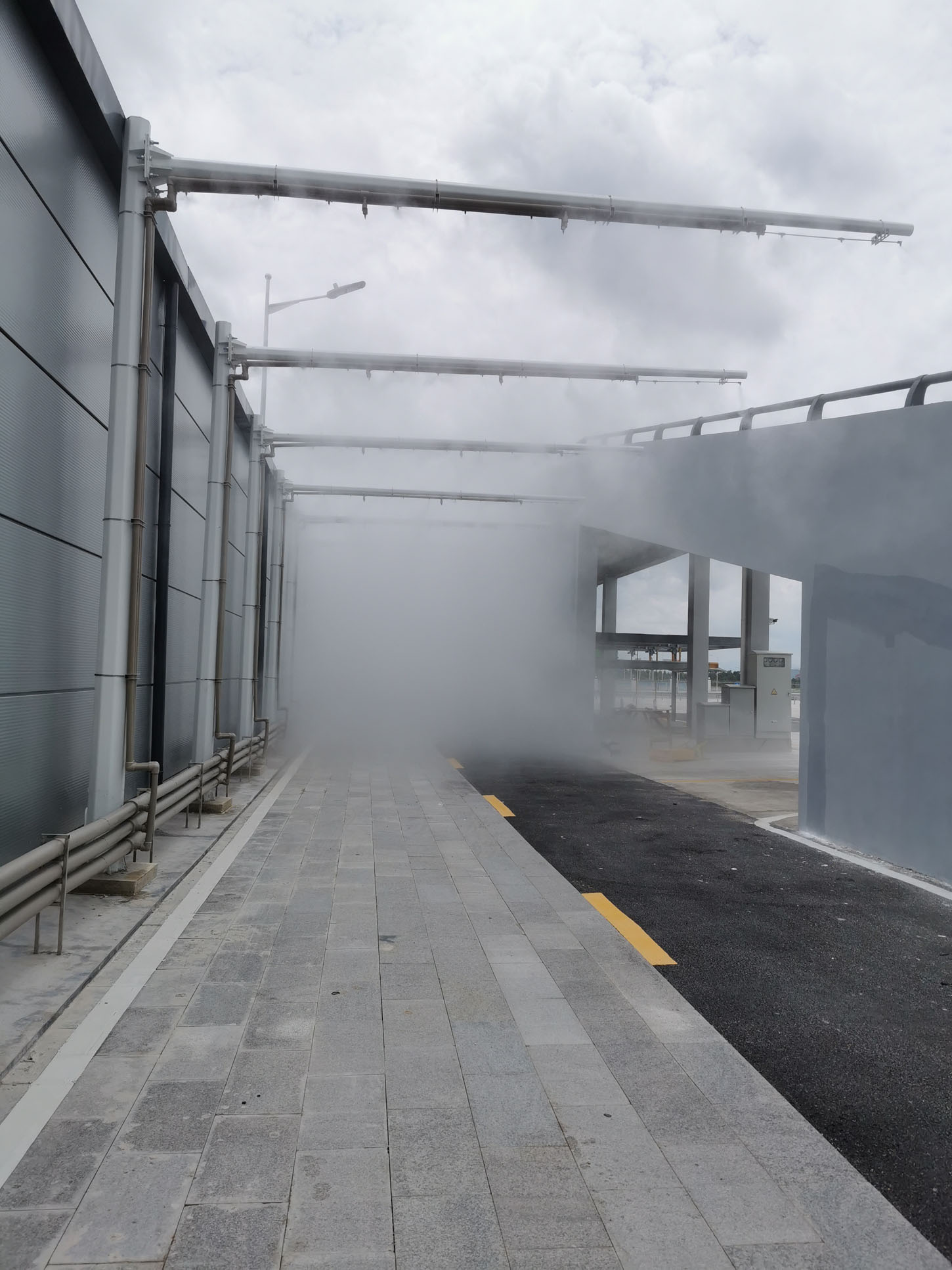 雨霧噴淋裝置|駕校雨霧噴淋|雨霧天氣噴淋雨霧噴淋設(shè)備包括行車道、高壓管路網(wǎng)、能見度儀和變頻高壓泵;高壓管路網(wǎng)架設(shè)在行車道的上方,用于模擬雨霧環(huán)境;能見度儀固定安裝在行車道的一側(cè),變頻高壓泵的出水口與高壓管路網(wǎng)的進水口連通。能夠精確控制汽車試驗場不同程度的雨霧能見度環(huán)境。