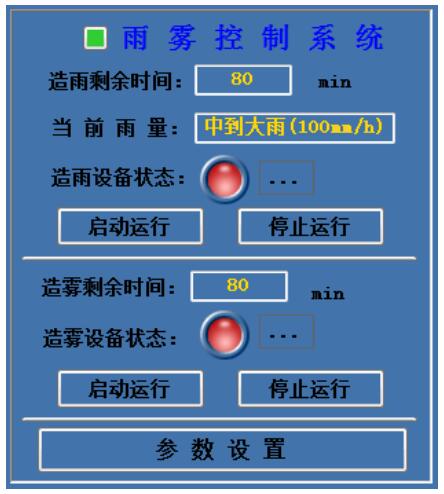進(jìn)行降雨試驗時,在電控操作室中的電控操作臺上發(fā)出降雨等級信號和降雨角度信號,由電機(jī)驅(qū)動水泵將水箱的水輸送到噴頭,并經(jīng)過流量調(diào)節(jié)系統(tǒng)自動調(diào)整符合降雨等級的降雨量,同時通過控制降雨板的旋轉(zhuǎn)角度來使水射向試件, 對試件進(jìn)行降雨試驗。