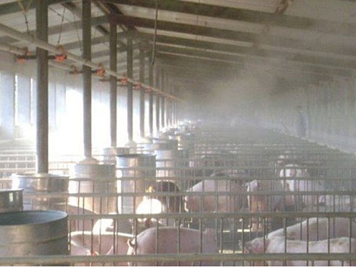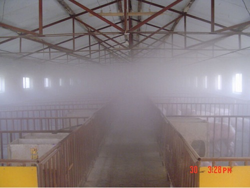目前豬舍降溫的手段并不多,通常使用通風(fēng)、配置風(fēng)扇、灑水等傳統(tǒng)手段進(jìn)行降溫,效果較差?,F(xiàn)今一種新型的噴霧降溫設(shè)備正廣泛的在市場上推廣開來,養(yǎng)豬場噴霧降溫設(shè)備在國外的養(yǎng)殖行業(yè)應(yīng)用情況非常普遍,其原理十分簡單,通過水霧吸收空氣熱量達(dá)到降溫的目的。而且,在豬舍中使用噴霧降溫設(shè)備除起到降溫的作用外,還有其他效果。首先就是防疫:在噴霧降溫設(shè)備水箱中添加藥劑可以起到撒藥的作用,傳播面積大且均勻,可以殺滅寄生蟲等有害微生物,防止生豬感染。另一個就是除臭,使用噴霧降溫設(shè)備,可以起到良好的除臭功能。最后,使用噴霧降溫設(shè)備可以起到加濕的作用,保持環(huán)境的濕潤,使生豬感覺更為舒適。