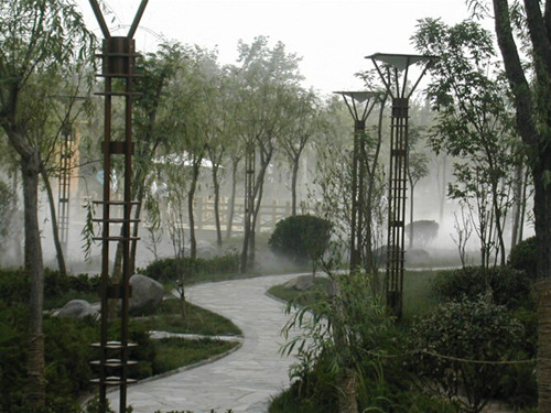 飄渺的霧覆蓋在碧綠的草地上,仿佛再現(xiàn)了山野田園的自然風(fēng)貌,而霧的升華,更有效的滋潤(rùn)、保護(hù)了綠地的生長(zhǎng),可謂一舉兩功效。