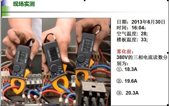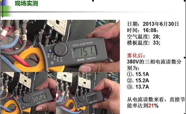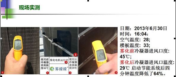 經(jīng)廣東福建兩省空調(diào)室外機(jī)安裝噴霧降溫系統(tǒng)試驗(yàn)測(cè)試,機(jī)房專(zhuān)用空調(diào)室外冷凝壓力在炎熱夏季從原先的2324kgf/cm2降低至1819kgf/cm2,下降4-5kgf/cm2。既冷凝溫度從60℃降低至50℃達(dá)10度之多,根據(jù)上述概算公式,粗略推算出機(jī)組的節(jié)能效率約為20%